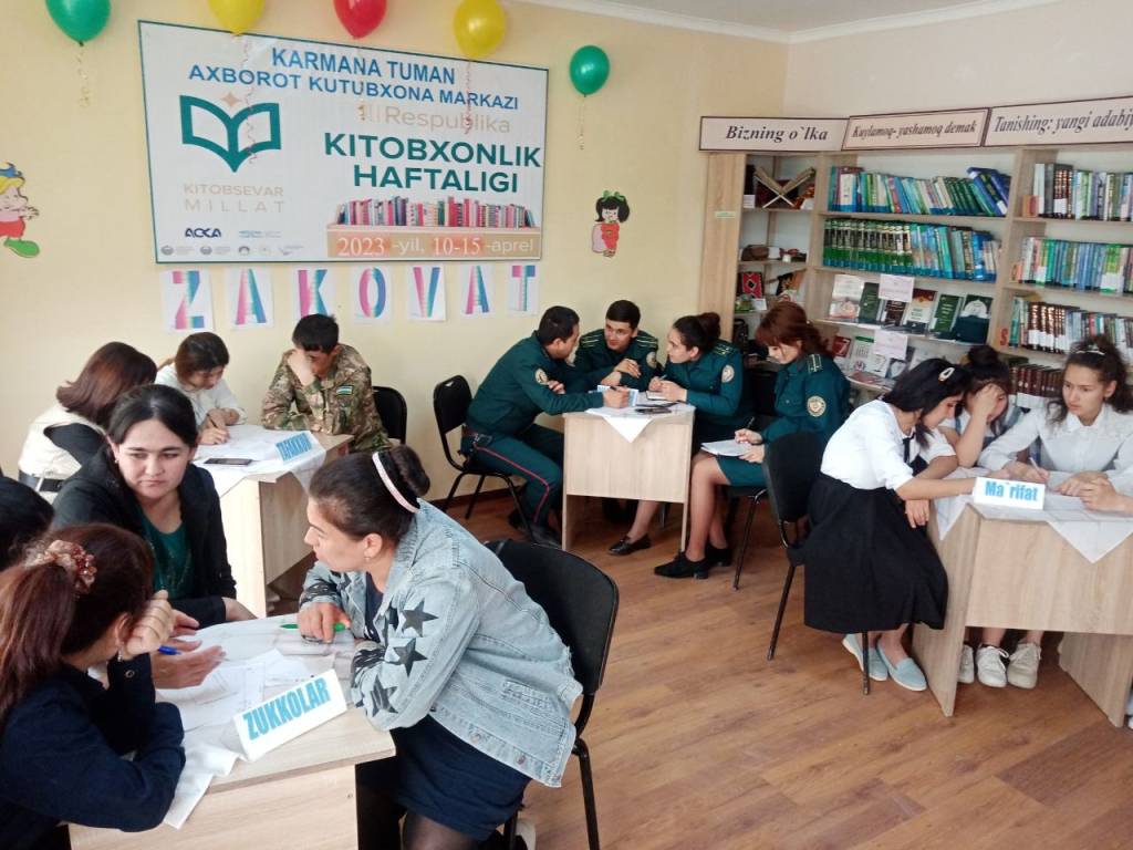 Karmana tumani Axborot-kutubxona markazida “Kitobsevar millat” shiori ostida “Kitobxonlik haftaligi” doirasida “Zakovat” intellektual bellashuvi tashkil etildi. Unda tuman tibbiyot birlashmasining “Zukkolar”, tuman ichki ishlar bo‘limining “Bilimdonlar”, harbiy qismning “Tafakkur” va Karmana kasb-hunar maktabining “Ma’rifat” jamoalari o‘zaro bellashdi. Qiziqarli o‘tgan bilimdonlar o‘yinida tuman ichki ishlar bo‘limining “Bilimdonlar” jamoasi g‘olib bo‘ldi.