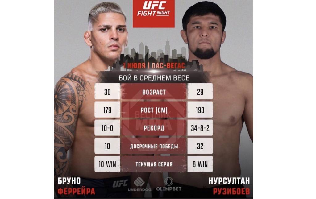 AQSHning Nevada shtati Las-Vegas shahrida tashkil etiladigan “UFC Fight Night” turnirida hamyurtimizning braziliyalik Bruno Ferreyraga qarshi oktagonga ko‘tarilishi kutilmoqda.