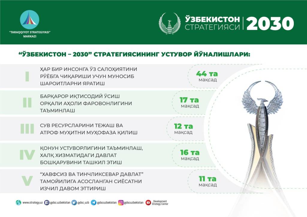 Strategiyada 5 ustuvor yo‘nalish bo‘yicha 100 ta muhim maqsad o‘z aksini topgan.