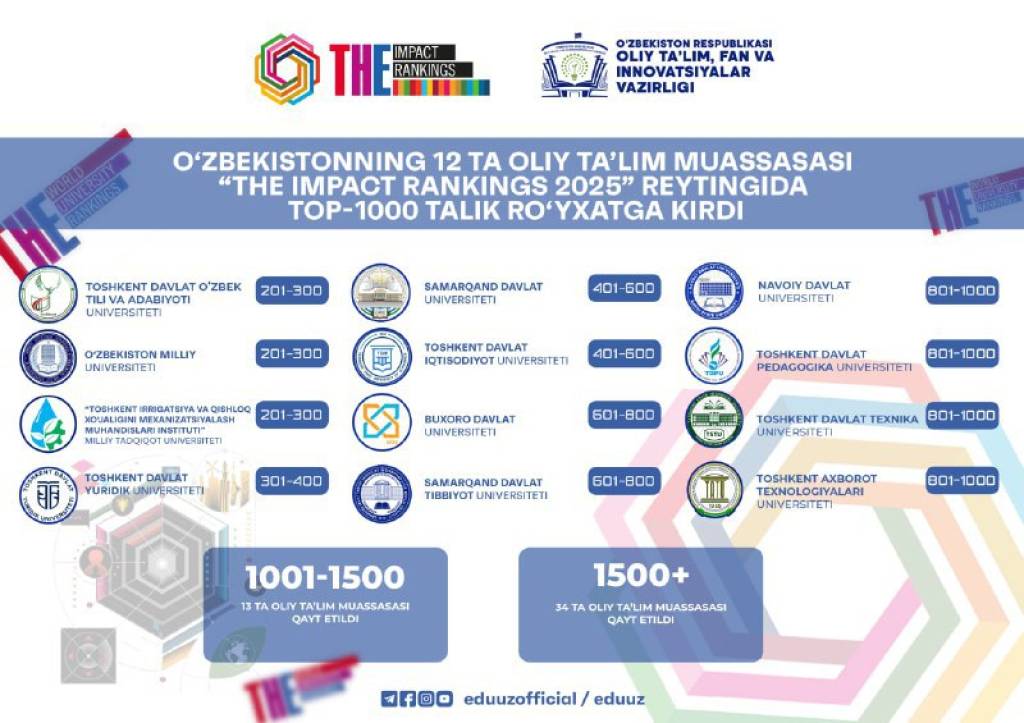 Ma’lumot o‘rnida ta’kidlash lozimki, 2021 yilda e’lon qilingan “THE Impact Rankings” reytingidan yurtimizning 12 ta, 2022 yilda 30 ta, 2023 yilda 47 ta, 2024 yilda esa 53 ta oliy ta’lim muassasasi o‘rin egallagan edi.