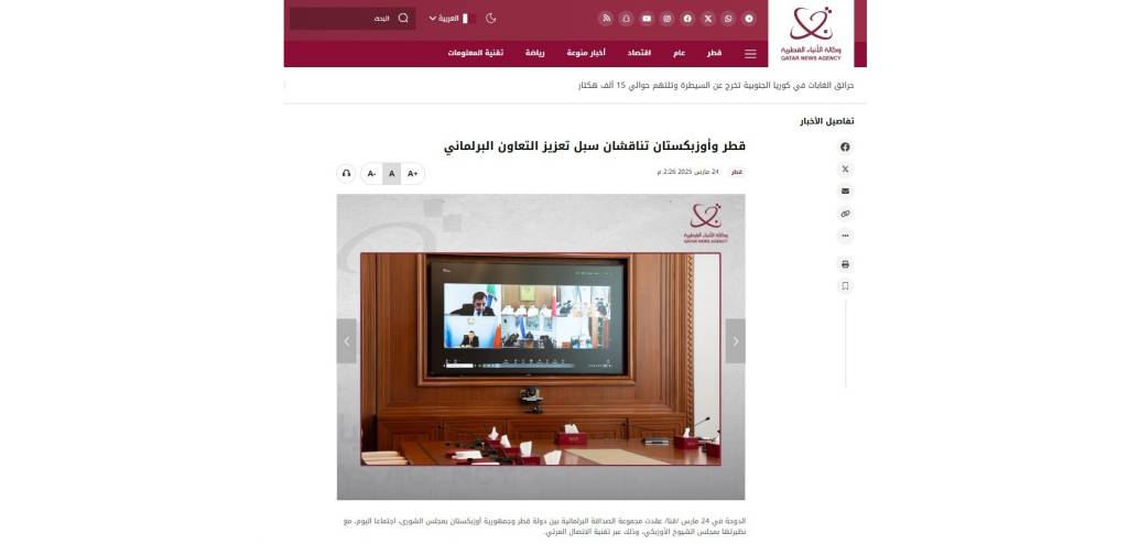 “QNA” axborot agentligi Qatar Davlati Sho‘ro Kengashi va O‘zbekiston Respublikasi parlamenti o‘rtasidagi do‘stlik guruhining videokonferensiya orqali uchrashuvi bo‘lib o‘tganini yoritdi.
