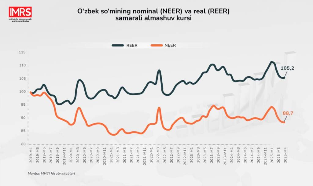 Tahlillar so‘mning 2025 yil aprel oyida AQSH dollariga nisbatan 0,5 foizga qadrsizlanganini, Rossiya rublining esa 20 foizga, Qozog‘iston tengesining 1,1 foizga qimmatlashganini ko‘rsatdi. Xitoy yuani esa faqat 0,1 foizga qadrsizlandi. Natijada so‘mning ushbu valyutalarga nisbatan nisbiy qadrsizlanishi REER indeksining pasayishiga asosiy turtki bo‘ldi.