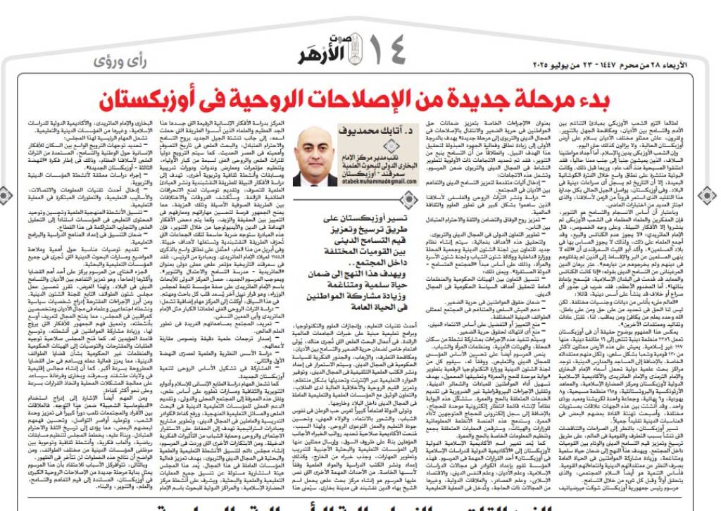 Misr Arab Respublikasida chop etiladigan yuksak nufuzga ega diniy-ma’rifiy nashrlardan biri — “Savtul Azhar” (“Al-Azhar ovozi”) gazetasida shu yilning 23 iyul kuni Imom Buxoriy xalqaro ilmiy-tadqiqot markazi direktori o‘rinbosari, tarix fanlari bo‘yicha falsafa doktori (PhD) Otabek Muhammadiyevning “O‘zbekistonda ma’naviy islohotlarning yangi bosqichi boshlandi” nomli maqolasi e’lon qilindi.