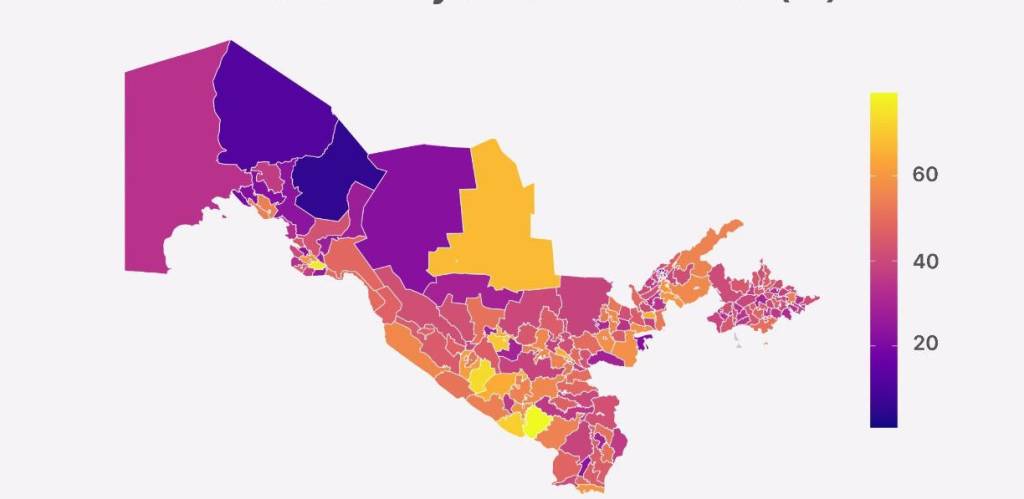 – Tungi yorug‘lik asosidagi tengsizlikni o‘lchashning muhim ustunliklaridan biri, bu tumanlar darajasida yuqori aniqlikda tahlil qilish imkoniyatidir. Uy xo‘jaliklari so‘rovnomalari odatda viloyat darajasida reprezentativ bo‘lsa, sun’iy yo‘ldosh ma’lumotlari orqali barcha tumanlar kesimida "Gini" indeksini hisoblash mumkin. Masalan, 2024 yil holatiga ko‘ra G‘uzor, Xonqa, Qorovulbozor, Nishon va Karmana tumanlarida tungi yorug‘lik bo‘yicha eng yuqori tengsizlik kuzatilgan. Bu hududlarda infratuzilma va iqtisodiy imkoniyatlarning notekis taqsimlangani ehtimoli yuqori.