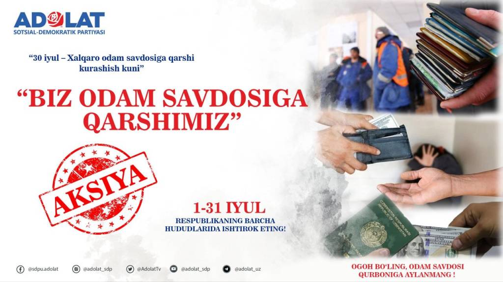 30 iyul – Xalqaro odam savdosiga qarshi kurashish kuni munosabati bilan O‘zbekiston “Adolat” sotsial-demokratik partiyasi tashabbusi bilan “Biz odam savdosiga qarshimiz” huquqiy-targ‘ibot oyligi e’lon qilindi.