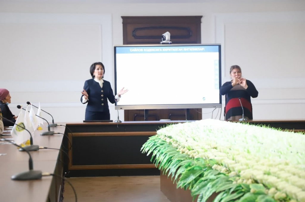 Karlar jamiyati viloyat bo‘limi bilan hamkorlikda uyuushtirilgan seminar davomida maxsus surdo tarjimon tomonidan ma’ruzachining barcha fikrlari tushuntirildi.