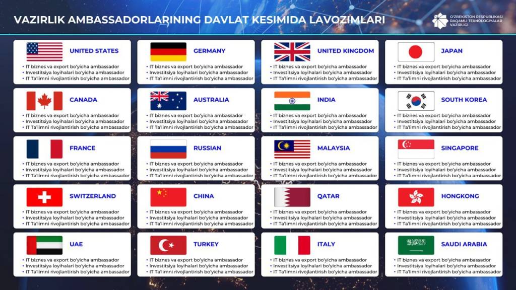 Shuningdek, xorijdagi vatandosh yoshlarni IT sohasiga keng jalb etish, Raqamli texnologiyalar vazirligi tomonidan amalga oshirilayotgan loyihalarga ilmiy tahlil asosida professional maslahatlar bilan ko‘maklashish maqsad qilingan.