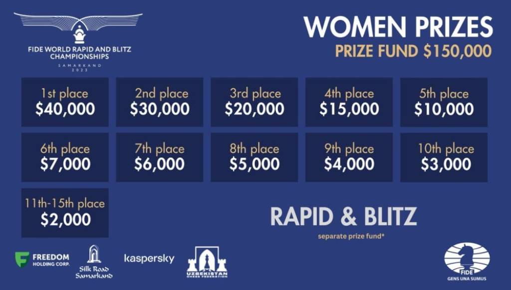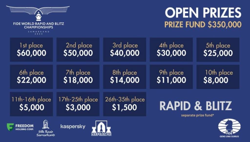 Aytish lozim, musobaqaning umumiy sovrin jamg‘armasi bir million AQSH dollarini tashkil etadi. Shundan 700 ming AQSH dollari ochiq turnirga va 300 ming AQSH dollari ayollar o‘rtasidagi musobaqa sovrindorlari o‘rtasida taqsimlanadi.