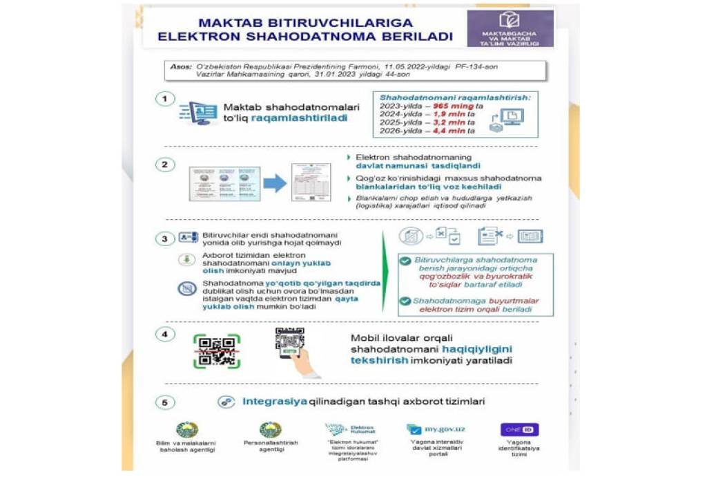 Shuni ham aytish kerakki, joriy o‘quv yilidan maktabning 9- va 11-sinfini tugatgan bitiruvchilarga shahodatnomalar elektron shaklda beriladi. Bu esa ta’lim sohasidagi qog‘ozbozlik, ortiqcha xarajat va ovoragarchiliklarning oldini olishga qaratilgan navbatdagi qadamdir.