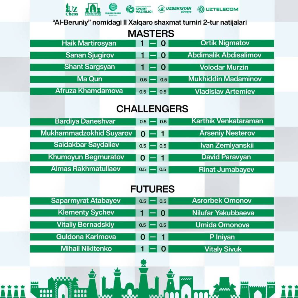 Ortda qolgan 2-tur bahslarida Ortiq Nigmatov va Abdumalik Abdusalimov qora donalarda Ayk Martirosyan va Sanan Syugirovga imkoniyatni boy berib qo‘ydi. Armaniston vakili Shant Sargsyan oq donalarda rapid bo‘yicha o‘tgan yilgi jahon chempioni Volodar Murzinni mag‘lubiyatga uchratdi. Syun Ma - Muhiddin Madaminov va Afruza Hamdamova - Vladislav Artemev o‘rtasida bahslarda murosa yo‘li tanlandi.