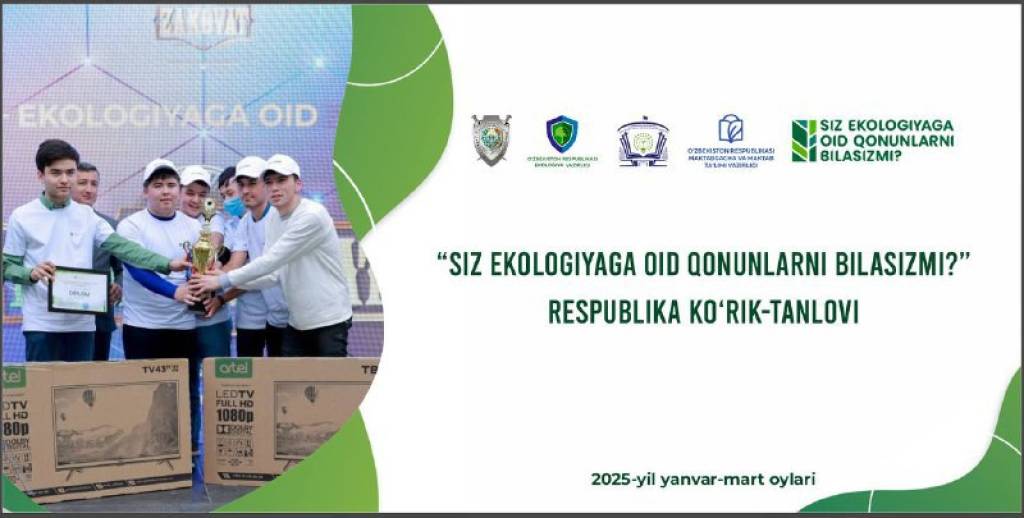 Joriy yilning yanvar-mart oylarida “Siz ekologiyaga oid qonunlarni bilasizmi?” respublika ko‘rik-tanlovi bo‘lib o‘tadi. 13–17 yanvar kunlari tanlovning saralash, 20–31 yanvar kunlari esa sektor bosqichlari tashkil etiladi.