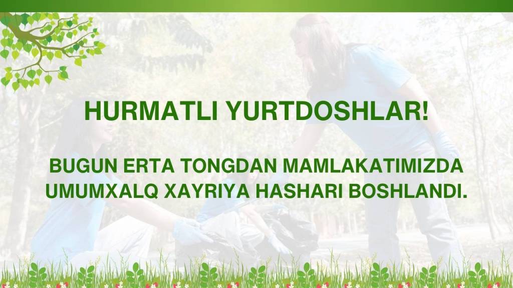 Bugun erta tongdan mamlakatimizda “Obod va fayzli mahalla – yurt ko‘rki” shiori ostida umumxalq xayriya hashari boshlandi.