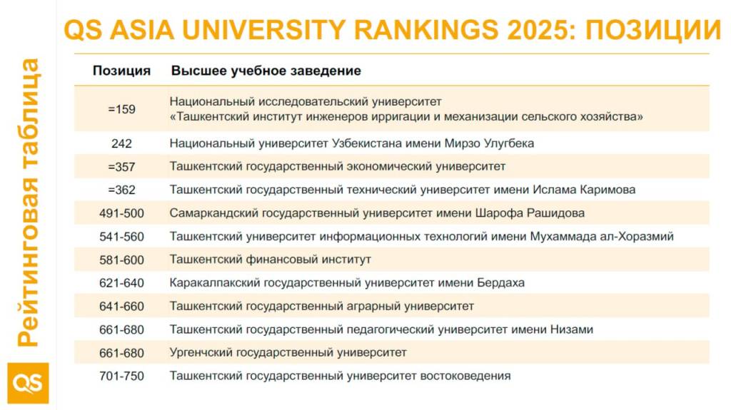 “QS World University Rankings” xalqaro reyting agentligi Osiyo universitetlarining 2025 yil uchun reyting natijalarini e’lon qildi.