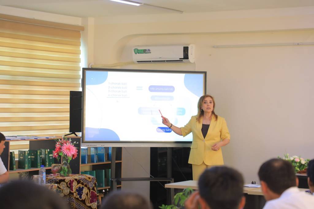 Seminar-trening jarayonida Pedagogik mahorat va xalqaro baholash ilmiy-amaliy markazi mutaxassislari tomonidan mezonlarga asoslangan baholash tizimining o‘ziga xos jihatlari, baholash mezonlarini belgilash tartibi, yangi baholash tizimini amaliyotda samarali qo‘llash bo‘yicha ma’lumot berildi.