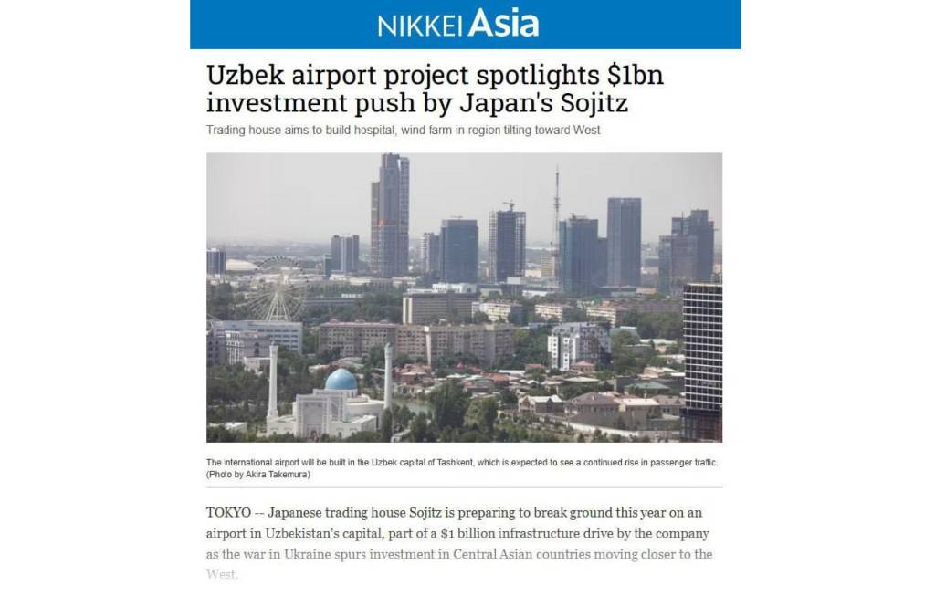 Yaponiyaning “Nikkei Asia” nashri ma’lum qilishicha, mazkur mamlakatning “Sojitz” korporatsiyasi Toshkent shahrida quriladigan yangi xalqaro aeroport loyihasiga 1 milliard dollarlik investitsiya yo‘naltiradi.