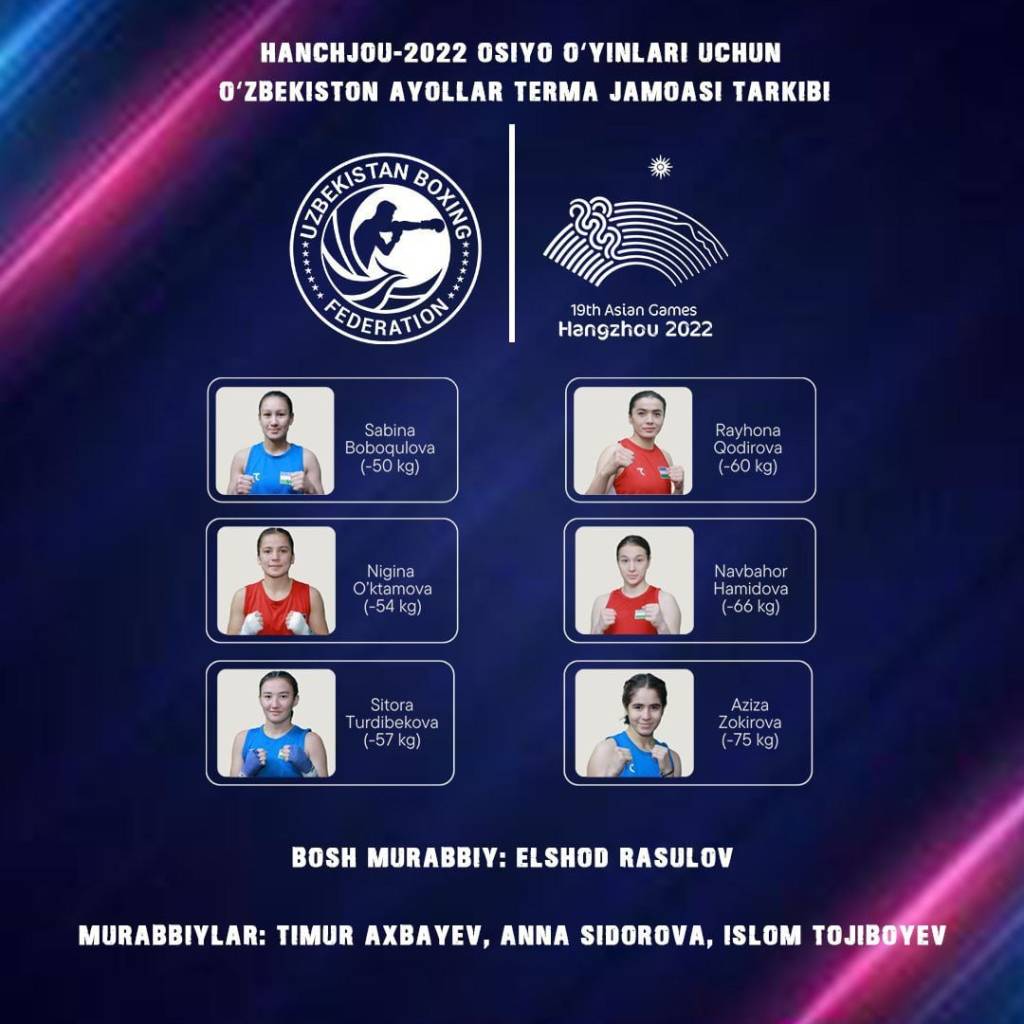 Мамлакатимиз боксчиларининг Россия ва Қозоғистонда ўтаётган халқаро мусобақалардаги ғалабали одими давом этаётган бир паллада жорий йилнинг 23 сентябрь — 8 октябрь кунлари Хитойнинг Ханчжоу шаҳрида ўтадиган XIX Осиё ўйинларида юртимиз шарафини ҳимоя қиладиган боксчилар номи маълум бўлди.