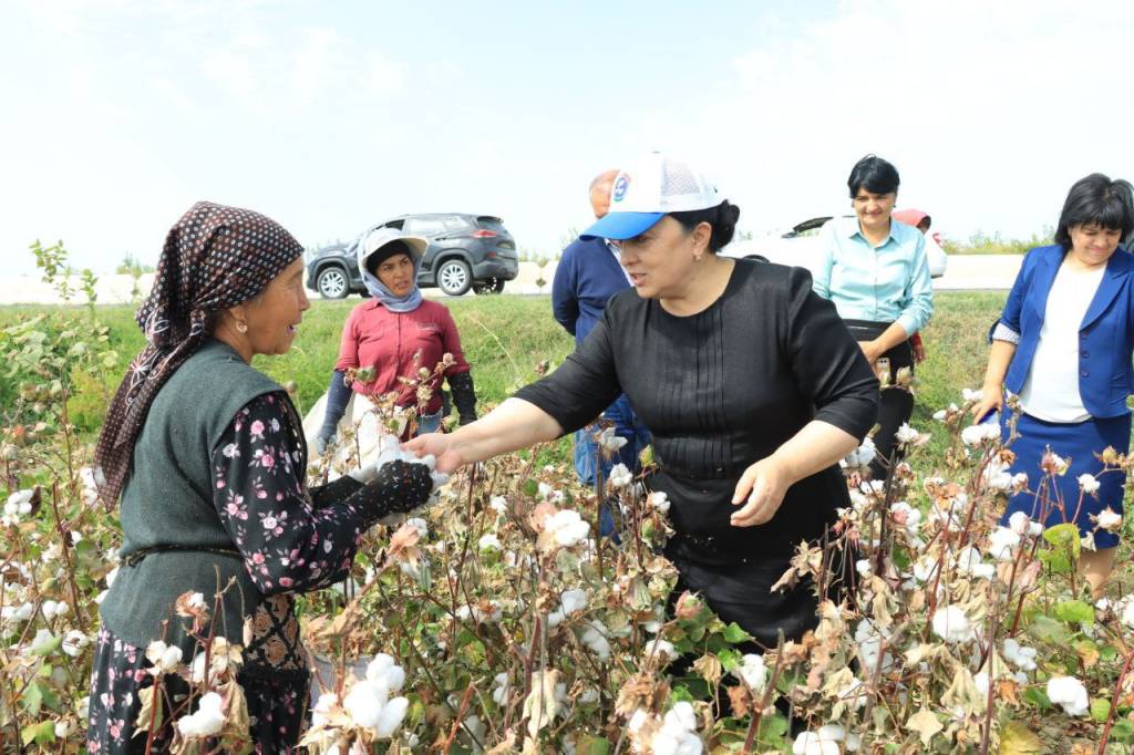 Ўзбекистон Республикаси Бош вазирининг ўринбосари Зулайҳо Маҳкамова Сирдарё вилоятининг Сирдарё туманидаги “Омонбой ўғли Тугал” фермер хўжалиги пахта даласида бўлиб, пахта йиғим-теримида иштирок этаётган теримчи аёллар билан суҳбатлашди.