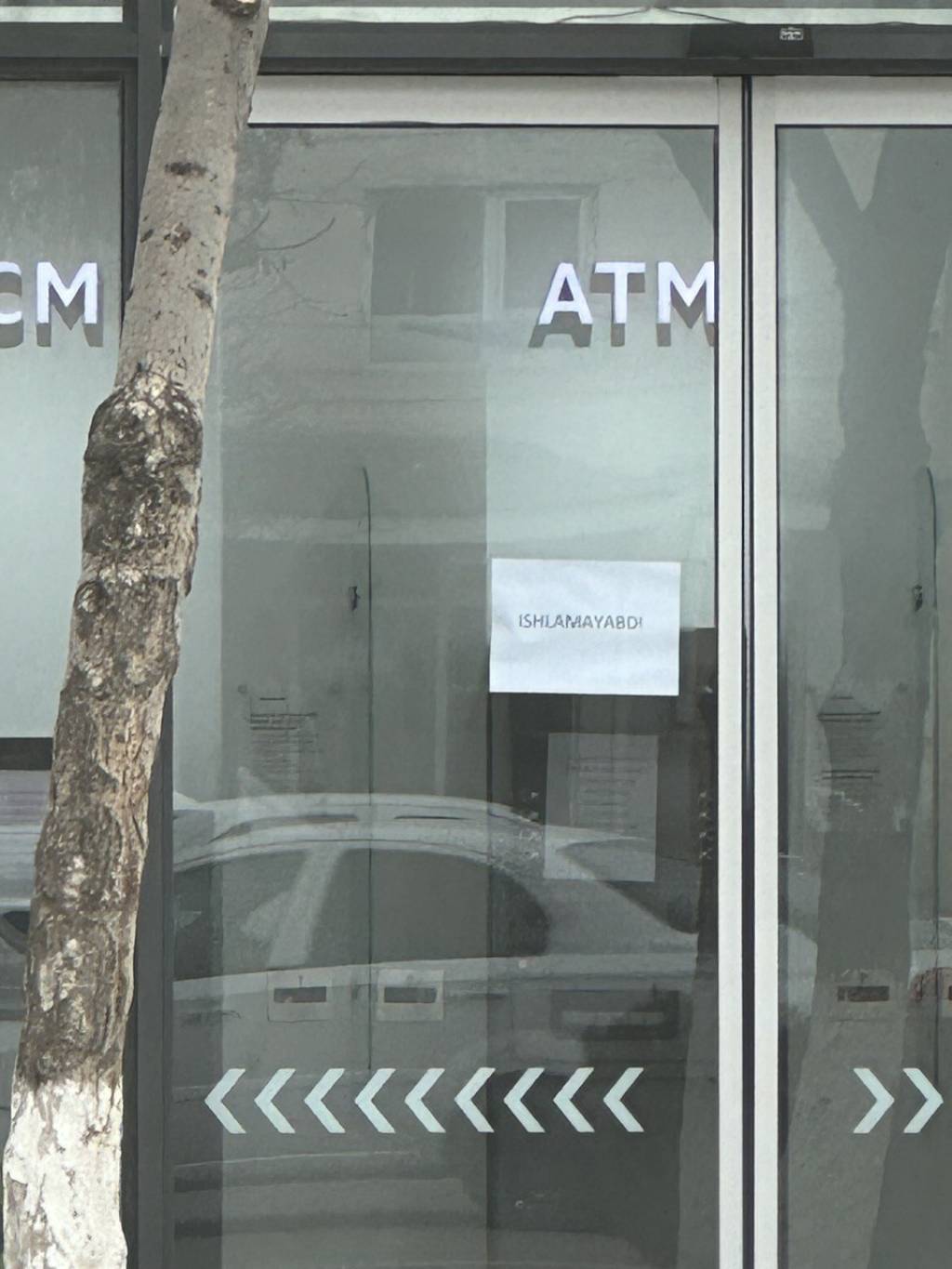Тушликка чиқиш пайтим пластик картамдан озроқ нақд пул ечиб олиш мақсадида Жиззах шаҳри “Қассоблик” маҳалла фуқаролар йиғини ҳудудида жойлашган акциядорлик тижорат “Агробанк”ка тегишли пул ечиб олиш шохобчасига, халқ тилида айтганда “банкомат”га бордим. Яқинлашишингиз билан эшиклари автоматик тарзда очиладиган эшигига чиройли қилиб: “ISHLAMAYABDI!”  деб ёзиб қўйишган экан.
