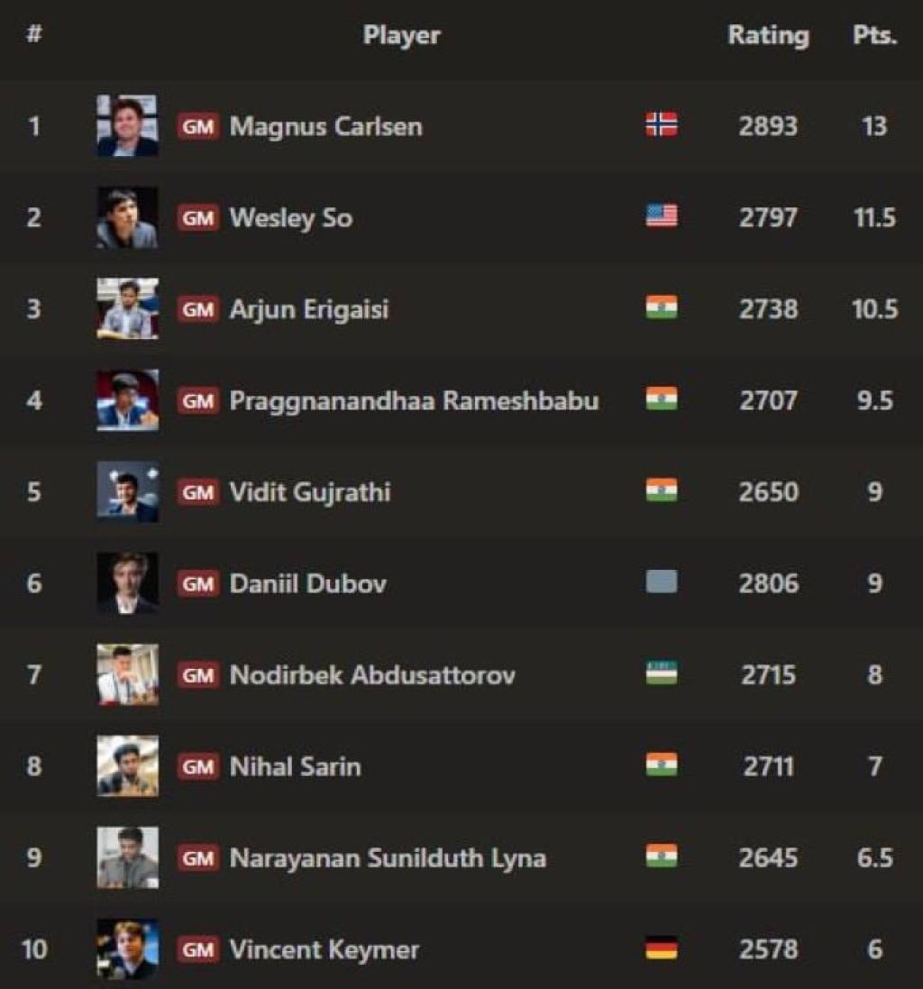 "Tata Steel Chess India" turnirining blits musobaqasida amerikalik Uesli So 11,5 ochko bilan 2-o‘rinni, hindistonlik Arjun Eragisi 10,5 ochko bilan 3-o‘rindan joy oldi.