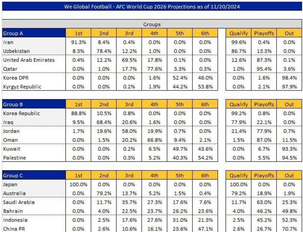 По завершении 6-го тура решающего отборочного этапа чемпионата мира по футболу 2026 года портал We Global Football обновил информацию о шансах национальных сборных.
