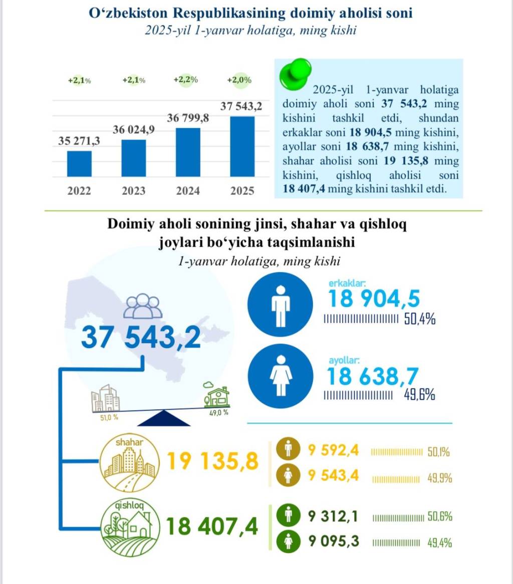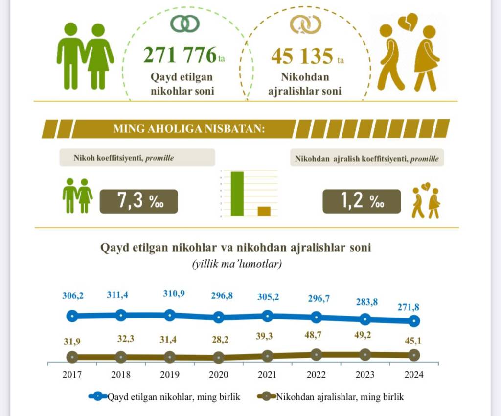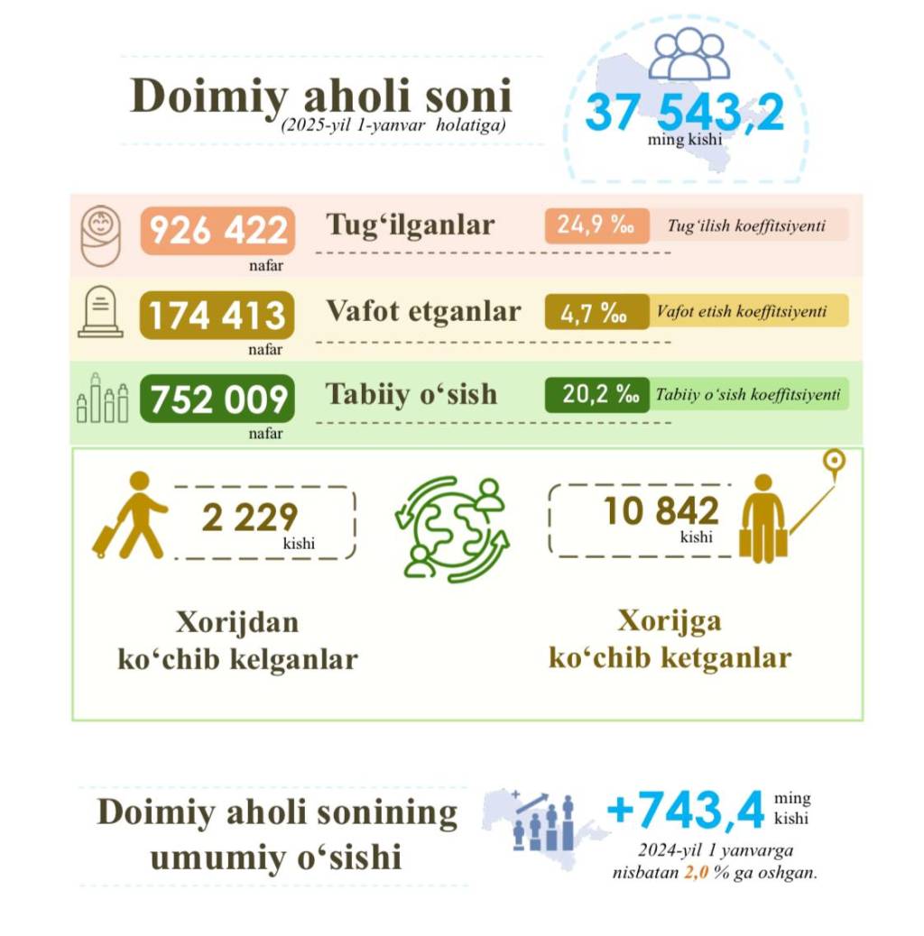 Президент ҳузуридаги Статистика агентлигининг маълум қилишича, Ўзбекистонда 2024 йилда 926,4 минг бола туғилди. Бу ўтган йилга нисбатан 3,7 фоизга кам бўлиб, туғилишлар сони 2017 йилдан бери илк бор пасайди.
