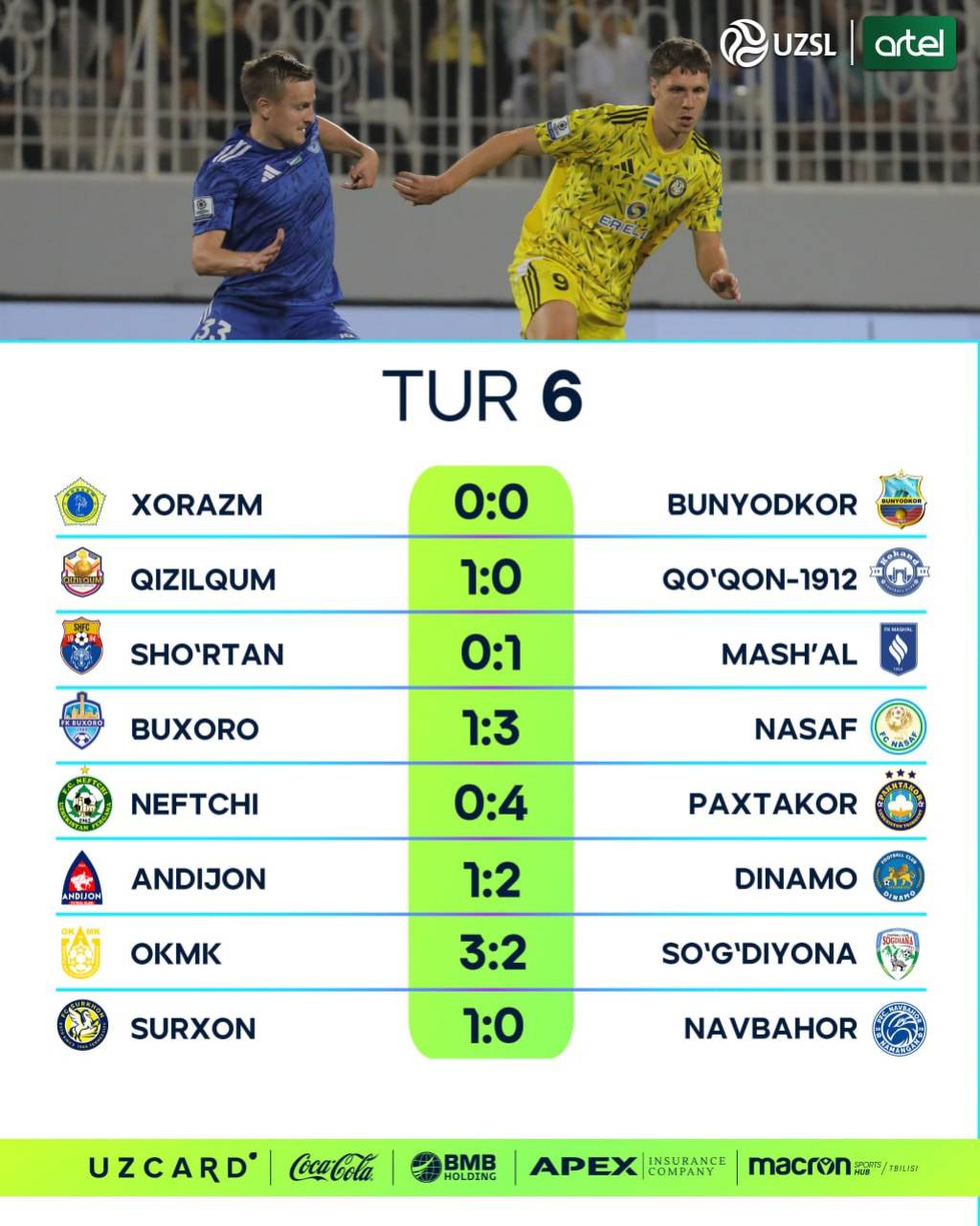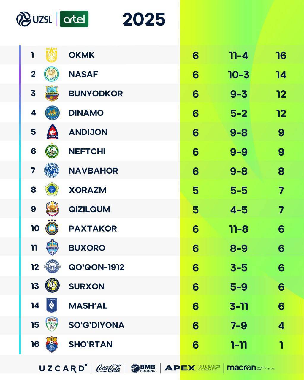 Футбол бўйича миллий чемпионатимизнинг олтинчи тури якунларига кўра, ОКМК 16 очко жамғарган ҳолда Суперлига жадвалида яққол пешқадамга айланди. Ушбу жамоани “Насаф” 14 очко жамғарган ҳолда таъқиб этмоқда. “Бунёдкор” ва “Динамо” клублари бир хил - 12 очко жамғариб, 3-4 поғонадан ўрин олди.