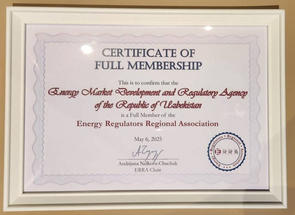 Ўзбекистон энергетика бозорини ривожлантириш ва тартибга солиш агентлигига Энергетика регуляторлари минтақавий ассоциацияси (ERRA) томонидан тўлақонли аъзоликни тасдиқловчи расмий сертификат топширилди.