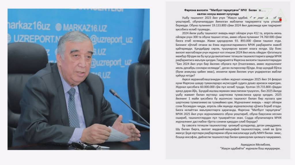 –Farg‘ona viloyati “Matbuot tarqatuvchi” MCHJ bilan yuzaga kelgan noxush vaziyat xususida, –deya so‘zini boshladi “Jahon adabiyoti” jurnalining bosh muharriri Ahmadjon Meliboyev.