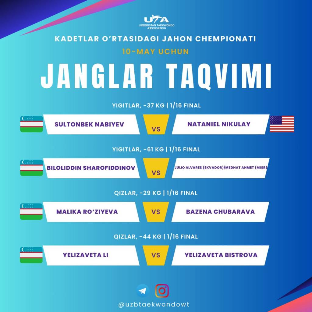 Қизлар ўртасидаги беллашувларда 29 кг вазн тоифасининг 1/16 финал босқичида Малика Рўзиева нейтрал мақомдаги спортчи Базена Чубарава билан, 44 кг вазн тоифасида эса Елезавета Ли яна бир нейтрал таэквондочи Елизавета Бистровага қарши жанг қилади.