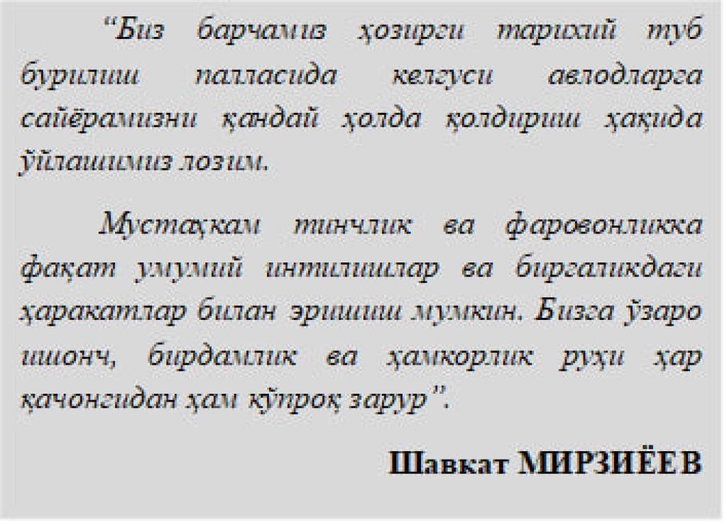 Bu fikrni tasdiqlash uchun oxirgi 7 yil mobaynida O‘zbekiston Prezidenti Shavkat Mirziyoyev tashabbusi bilan BMT Bosh Assambleyasi tomonidan 11 ta rezolyutsiya qabul qilinganini ta’kidlashning o‘zi kifoya.