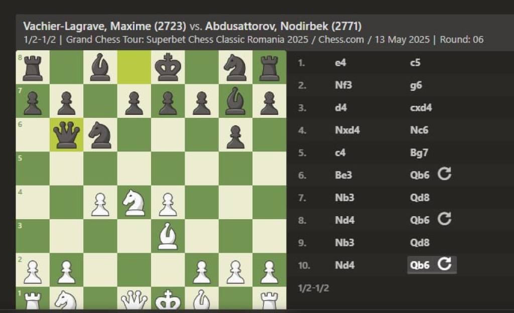 Umumiy mukofot jamg‘armasi 350 ming AQSH dollaridan iborat xalqaro turnirning kecha o‘tkazilgan 6-turida Nodirbek fransiyalik Maksim Vashe-Lagravga qarshi qora donalarda harakatlandi.