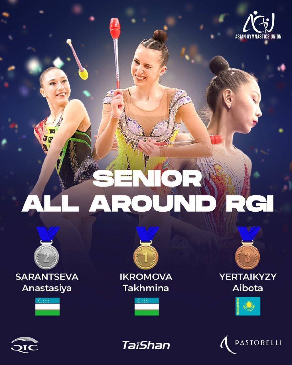Тахмина Икромова, Анастасия Саранцева, Наталья Усова, Мумтоза Исҳоқзода, Иродахон Содиқова, Эвелина Аталянc, Амалия Мамедова, Аделя Файзулина, Мафтуна Заировадан иборат катталар терма жамоаси Ўзбекистон спортчиларининг маҳоратини намойиш этган бўлса, Виктория Никифорова, София Усова, Алана Ҳафизова, Милана Сафина, Кристина Шин, Жасмин Яхлакова, Ёсина Жўраева, Замира Хвалчевадан иборат ўсмир гимнастикачиларимиз яккалик ва гуруҳ мусобақаларида совринли ўринларга эгалик қилди.