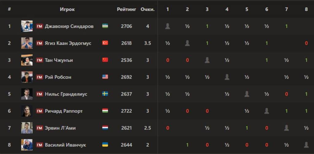 Ortda qolgan o‘yinlar sarhisobiga ko‘ra, Sindorov peshqadamlik qilayotgan vaziyatda turkiyalik Yagiz Kaan Erdogmus 3,5 ochko bilan keyingi pog‘onani band etib turibdi. Ulardan keyingi qatorlarda 3 ochko jamg‘argan xitoylik Tan Chjun’i, amerikalik Rey Robson, shvetsiyalik Nils Grandelius joy olishgan.