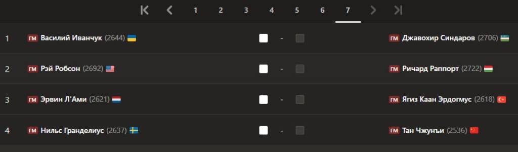 Bugun xalqaro turnirning so‘nggi 7-turida Javohir Sindorov qora donalarda 2 ochko bilan oxirgi o‘rinda borayotgan ukrainalik tajribali grossmeyster Vasiliy Ivanchuk bilan kuch sinashadi.