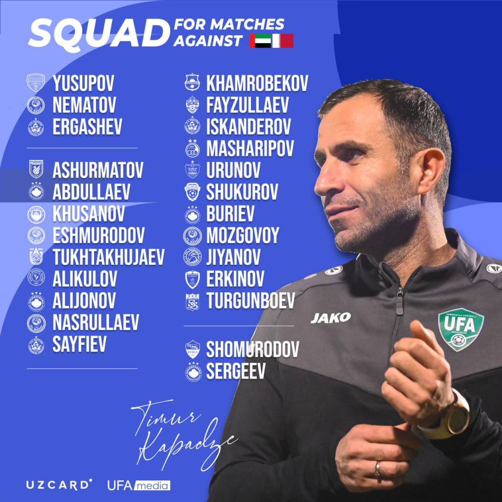 O‘zbekiston milliy terma jamoasi bosh murabbiyi Timur Kapadze  tomonidan yig‘inga jalb etilgan futbolchilarning ro‘yxati e’lon qilindi: