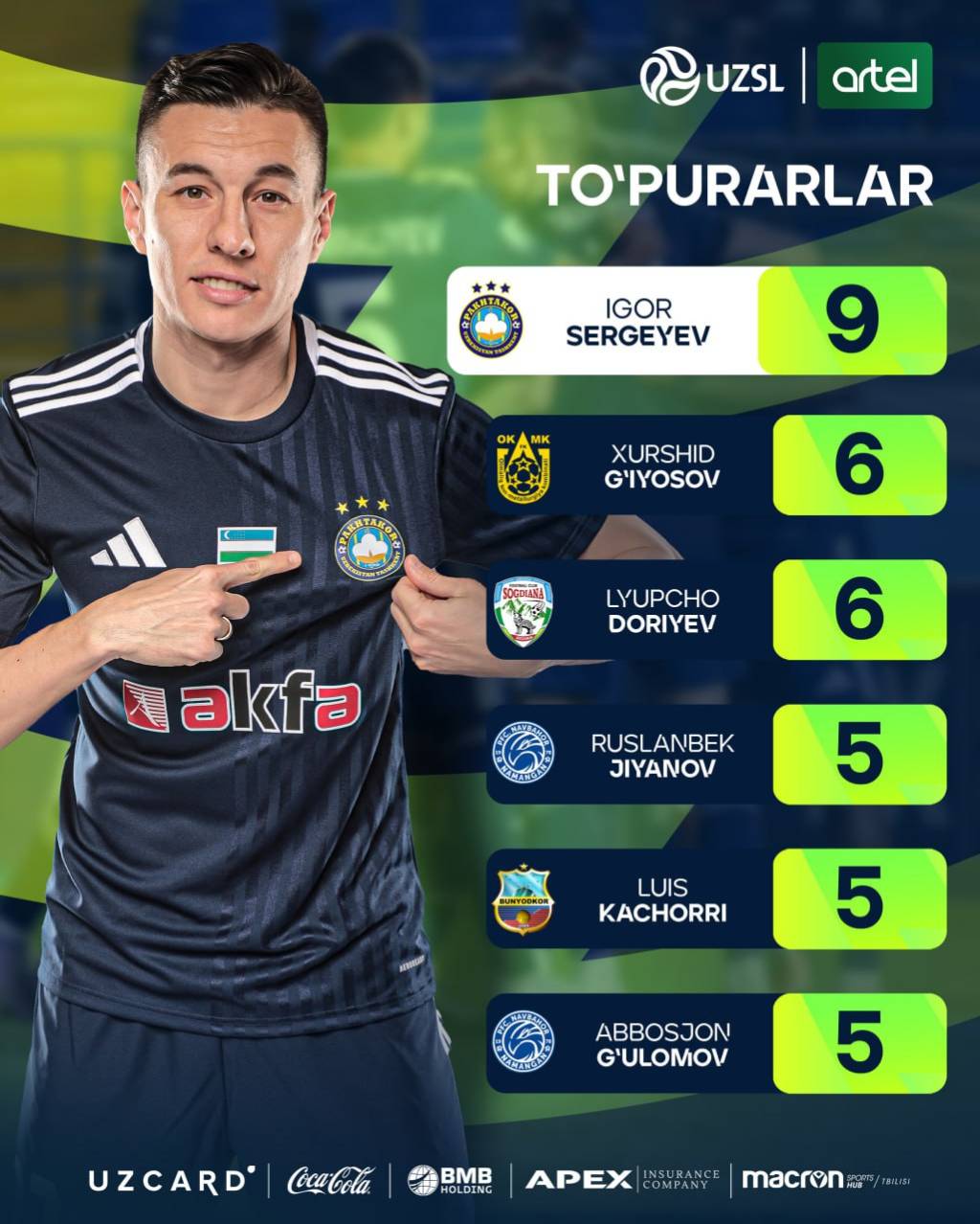 Дарвоқе, “Пахтакор” клуби аъзоси Игорь Сергеев бу турда урган голи эвазига Суперлигада "Пахтакор" сафидаги голларини 110 тага етказиб олди ва жамоада энг кўп гол урган футболчига айланди. Шунингдек, айни дамда Игорь Суперлигада 11 та ўйинда 9 та гол уриб, тўпурарлар рўйхатини бошқармоқда.