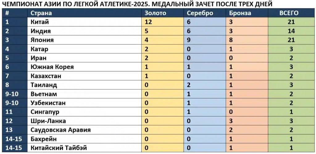 Жанубий Кореянинг Куми шаҳрида енгил атлетика бўйича давом этаётган Осиё чемпионатининг тўртинчи кунги мусобақалари остонасида 21 та медаль билан Хитой жамоаси пешқадамлик қилмоқда. Ўзбекистонлик енгил атлетикачилар 39 та давлат орасида 1 та кумуш, 1 та бронза медали билан кучли ўнликда бормоқда.