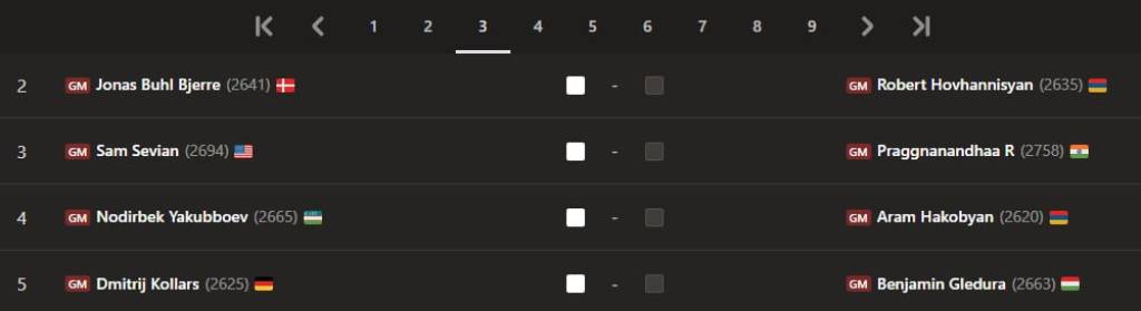Ҳамюртимиз Нодирбек Ёқуббоев 2-турда қора доналарда ўсмирлар ўртасидаги Европа чемпиони венгриялик Беньямин Гледурага қарши дона сурди. Тенг курашлар остида ўтган учрашувнинг 33-юришидан кейин томонлар муроса йўлини танлади.
