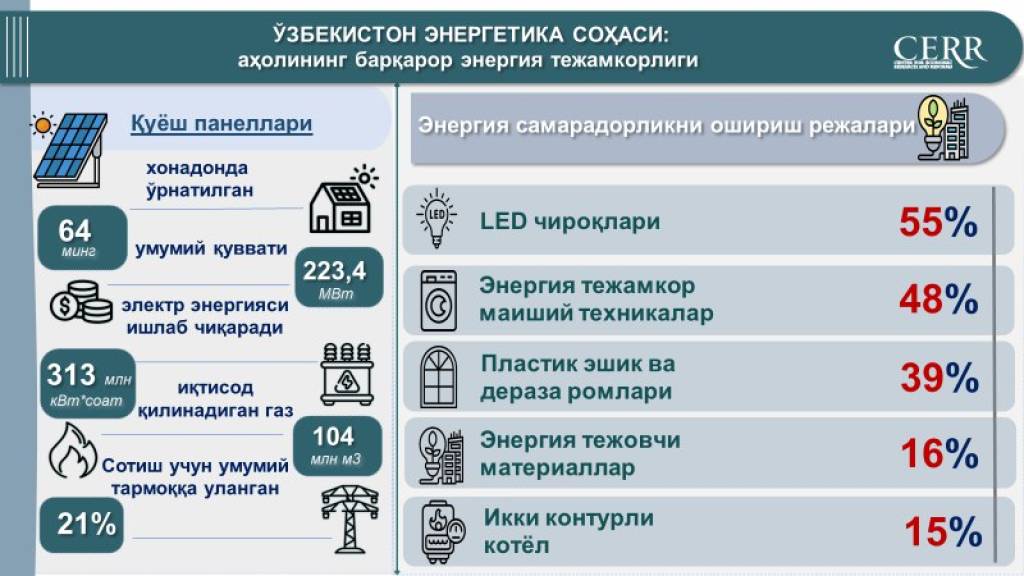 Respublikadagi 64 ming uy xo‘jaliklarida umumiy quvvati 223,4 MVt/soat bo‘lgan quyosh panellari o‘rnatilgan. Yillik ishlab chiqarish qariyb 313 mln kVt/soatni tashkil etadi, bu orqali 104 mln kub metr tabiiy gaz tejaldi.