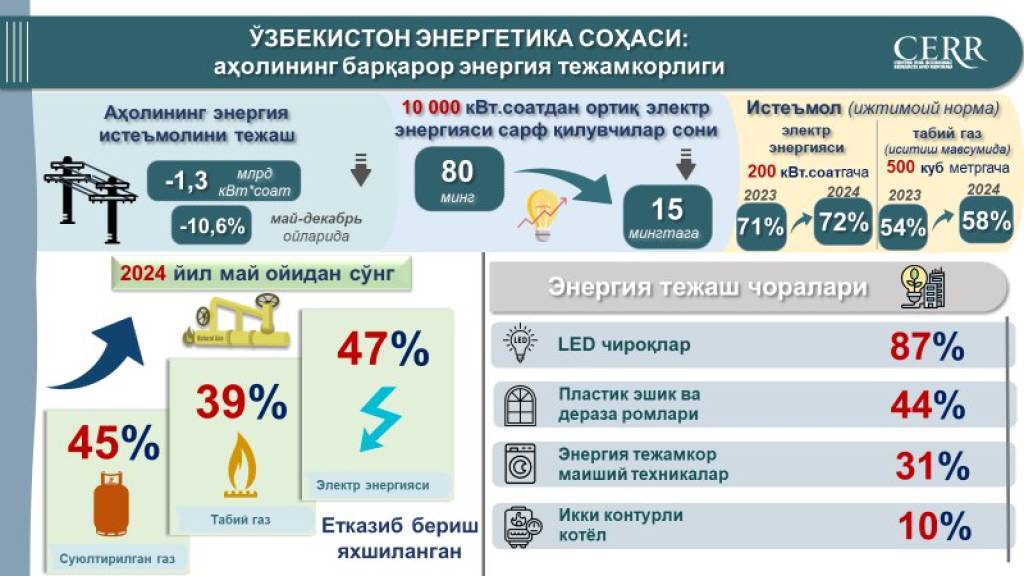 Ijobiy o‘zgarishlardan yana biri uy xo‘jaliklarida maishiy darajada energiya tejash choralarini keng joriy etish bo‘ldi.