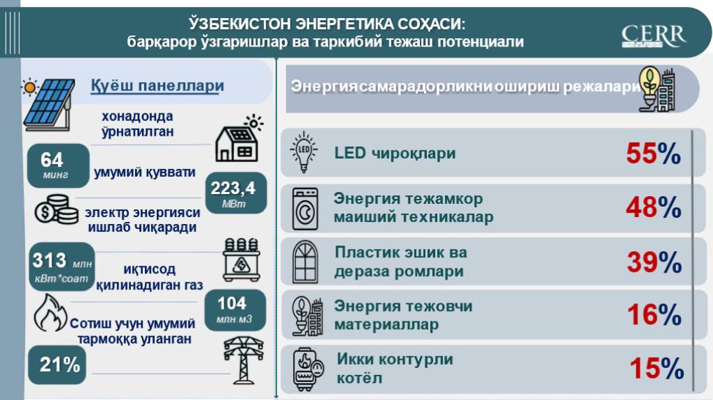 Республикадаги 64 минг уй хўжаликларида умумий қуввати 223,4 МВт/соат бўлган қуёш панеллари ўрнатилган. Йиллик ишлаб чиқариш қарийб 313 млн кВт/соатни ташкил этади, бу орқали 104 млн куб метр табиий газ тежалди.