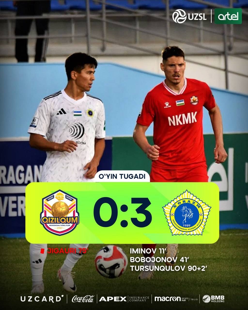 Mazkur bahsda “Xorazm” safarda o‘ynagan bo‘lsa-da, Humoyunmirzo Iminov, Murod Bobojonov va Hazratjon Tursunqulov urgan gollar evaziga 3:0 hisobida “Qizilqum”ni yengdi.