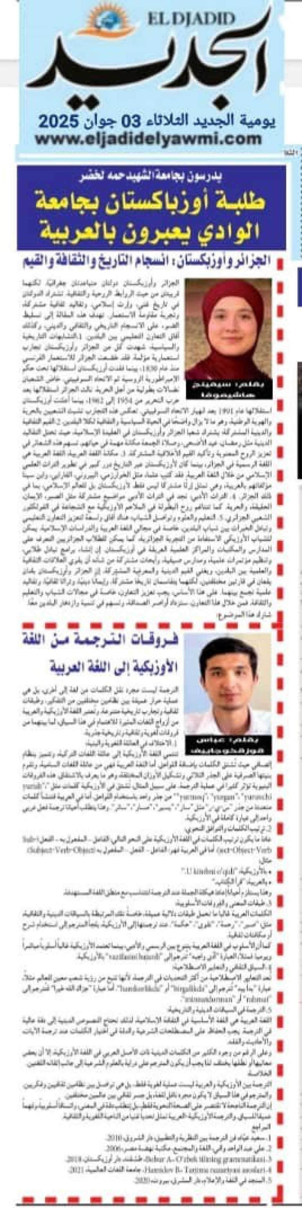 “Ал-Жадид” нашрида Жазоир Халқ Демократик Республикаси Водий университети араб тили курсида таҳсил олаётган Ўзбекистон давлат жаҳон тиллари университети талабаларининг мақолалари “Фикр ва ёзув” рукни остида эълон қилинди.