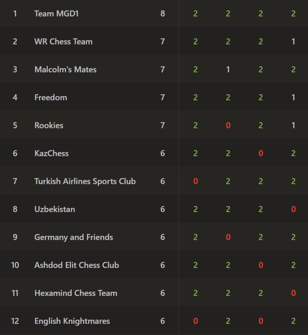 52 ta jamoa ishtirok etgan ilk kungi musobaqalar sarhisobiga ko‘ra, Ardjun Erigaysi sardorligidagi Hindistonning “MGD1” jamoasi 4 ta imkoniyatdan unumli foydalangan holda 8 ochko bilan yakka peshqadamlikka erishdi. Keyingi o‘rinlarni egallagan “WR Chess”, “Freedom” va musobaqada ilk bor qatnashayotgan Britaniyaning “Malcolm’s Mates” jamoasi keyingi pog‘onalarni band etdi.