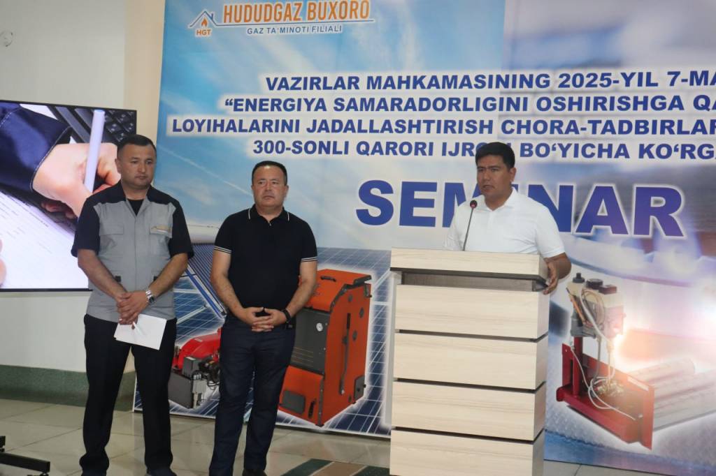 В филиале газоснабжения «Худудгаз Бухоро» при участии областного хокимията и областной прокуратуры был организован показательный семинар по вопросам исполнения постановления Кабинета Министров «О мерах по ускорению реализации проектов, направленных на повышение энергоэффективности» от 7 мая 2025 года.