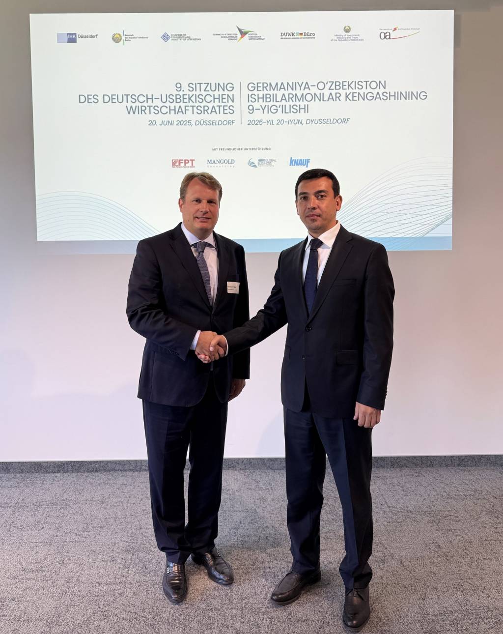 20 июня 2025 года в Дюссельдорфе прошло очередное 9-е заседание Германо-Узбекского делового совета (ГУДС), которое стало важной платформой для обсуждения перспектив расширения инвестиционного сотрудничества и реализации совместных проектов между деловыми кругами Узбекистана и Германии.