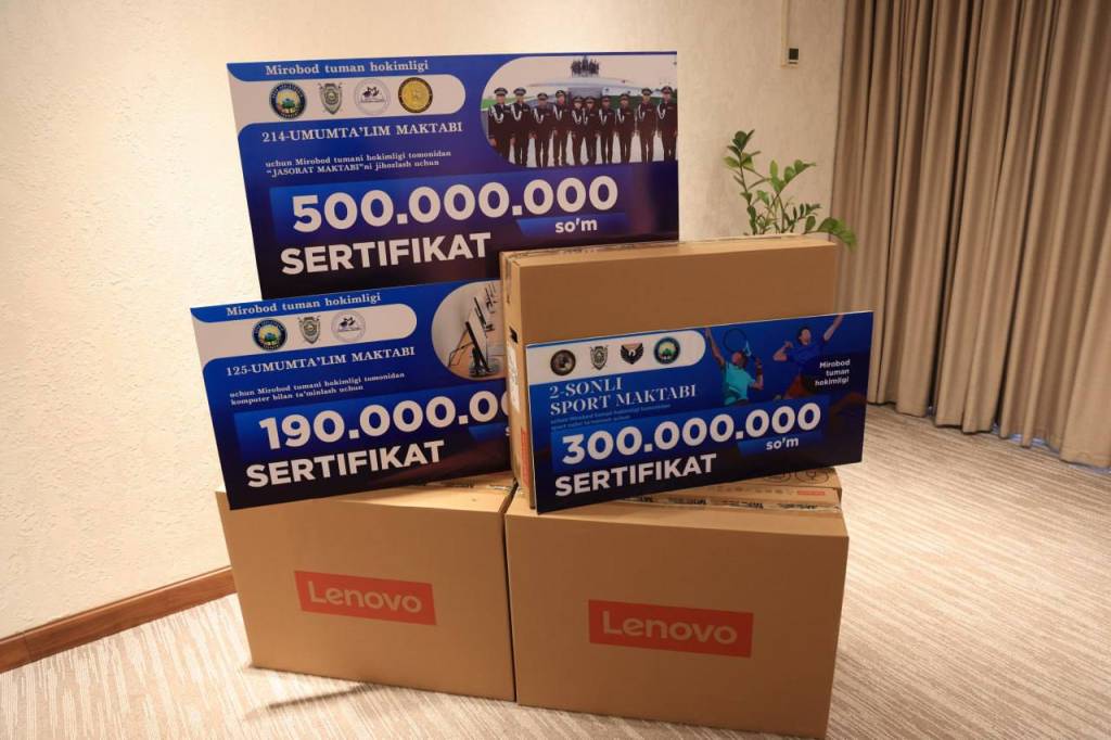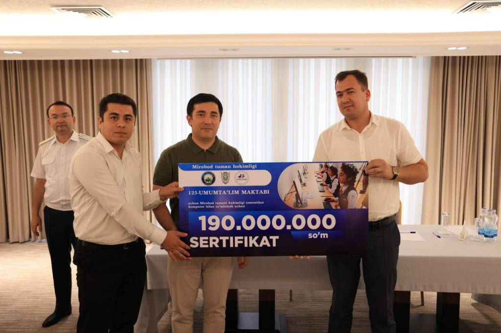 Жумладан, 125-умумтаълим мактаби учун 190 миллион сўмлик компьютер жиҳозлари, 2-сонли спорт мактабининг спорт зали таъмири учун 300 миллион сўм, 214-сонли “Жасорат мактаби” синф хоналарини жиҳозлаш учун 500 миллион сўмлик сертификат топширилди ҳамда туман Ахборот-ресурс марказига 6 та компьютер жамланмаси тақдим этилди.