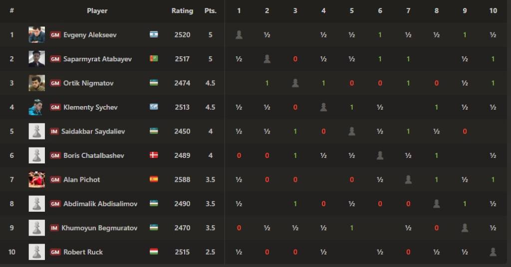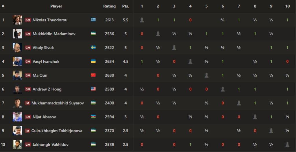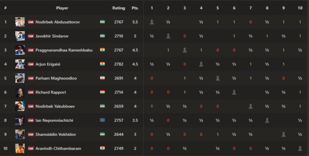 Сўнгги тур ўйинлари остонасида Абдусатторов 5,5 очко билан етакчи, Синдоров 5 очко билан кейингиўринни, 4,5 очколи Праггнанандха ҳамда Эригаиси 3-ўринларда бормоқда.