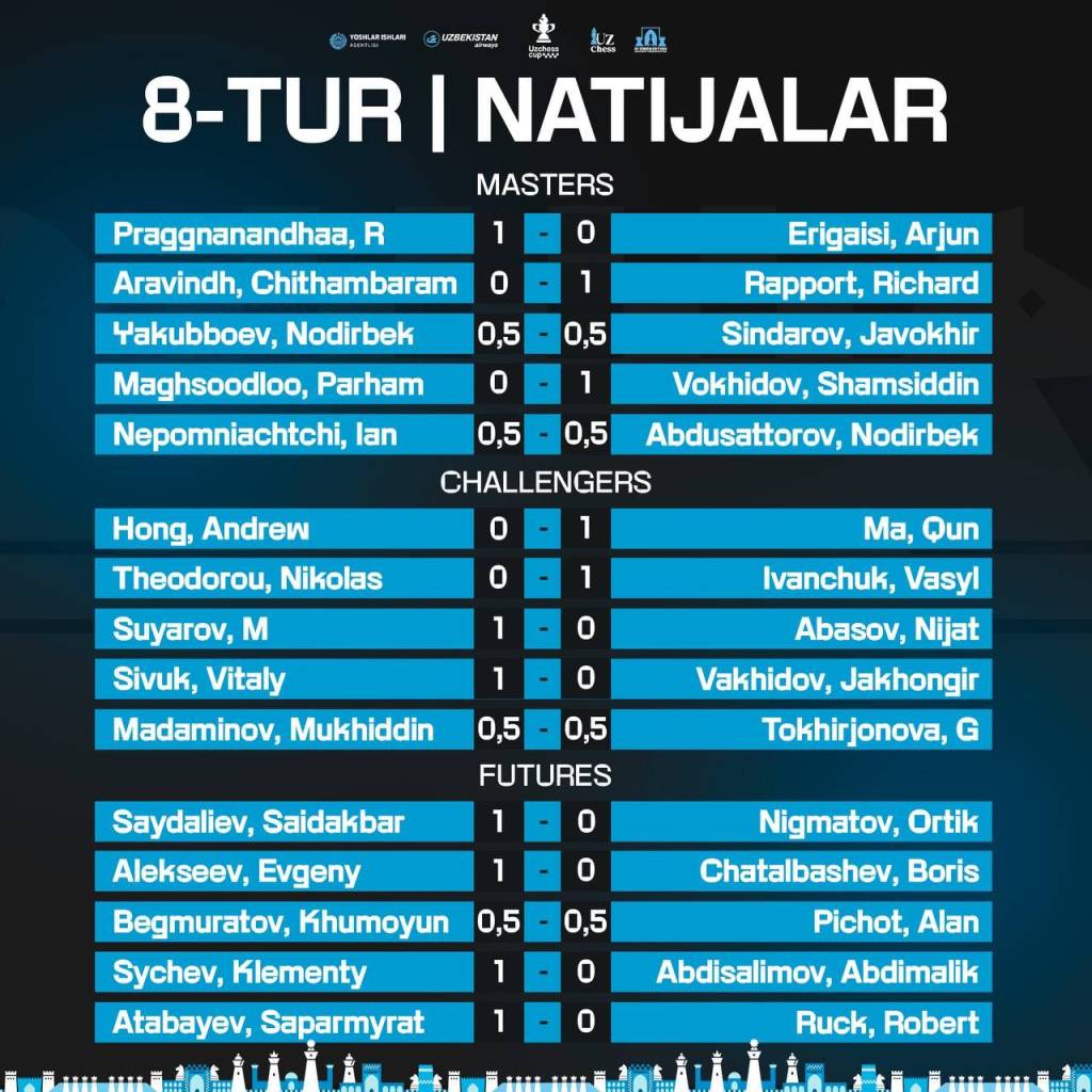 Нуфузли мусобақанинг"Masters", “Challengers" ва “Futures" гуруҳларида кеча ўтказилган 8-тур баҳслари қайсидир маънода совриндор бўлишга яқин шахматчиларномини аниқлаб берди.