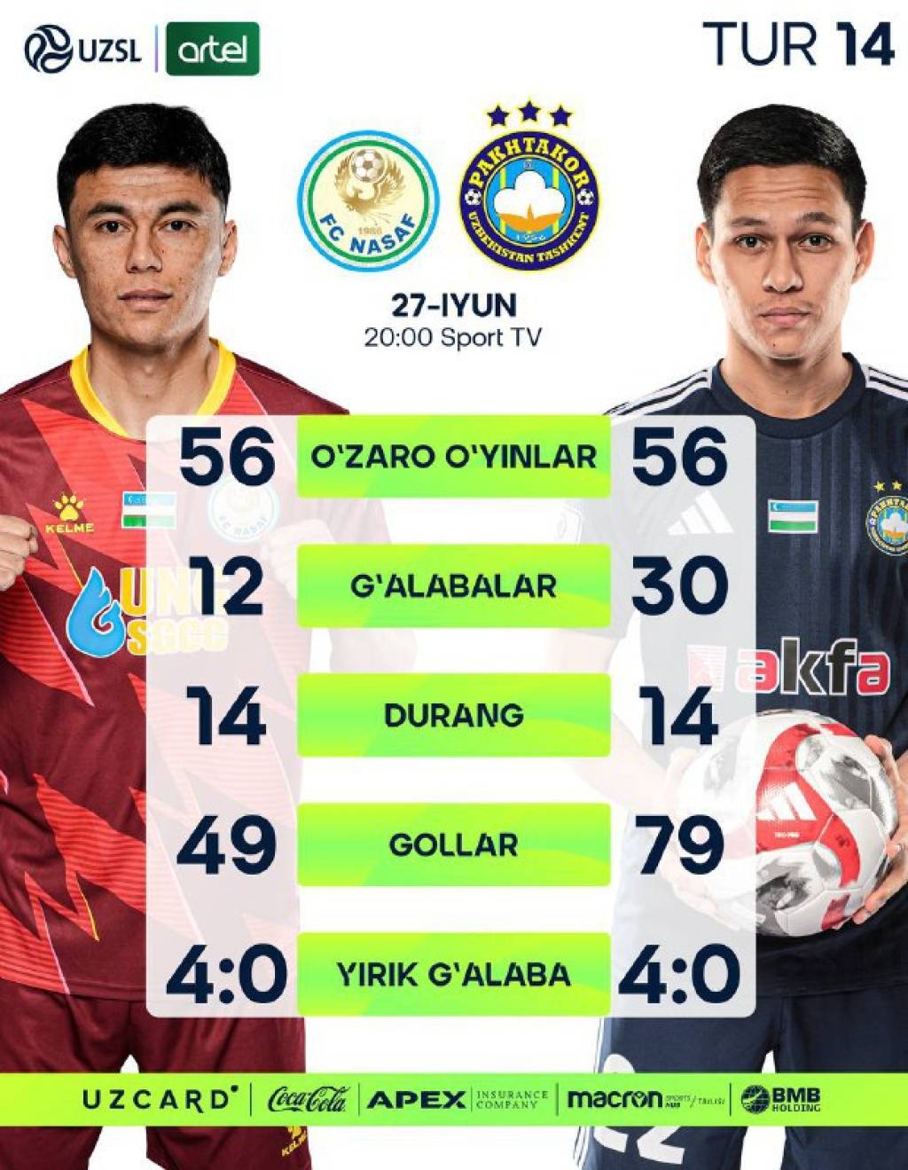 В 14-м туре Суперлиги Узбекистана по футболу состоятся матчи «Насаф» – «Пахтакор» и «Коканд-1912» – «Динамо».